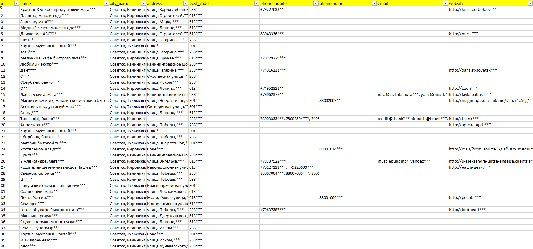 База организаций Советск, вся Россия в формате Excel с эл. почтами, телефонами, сайтами, ссылками на соц сети, координатами и другой информацией. Скачайте демо версию, чтобы ознакомиться с данными.