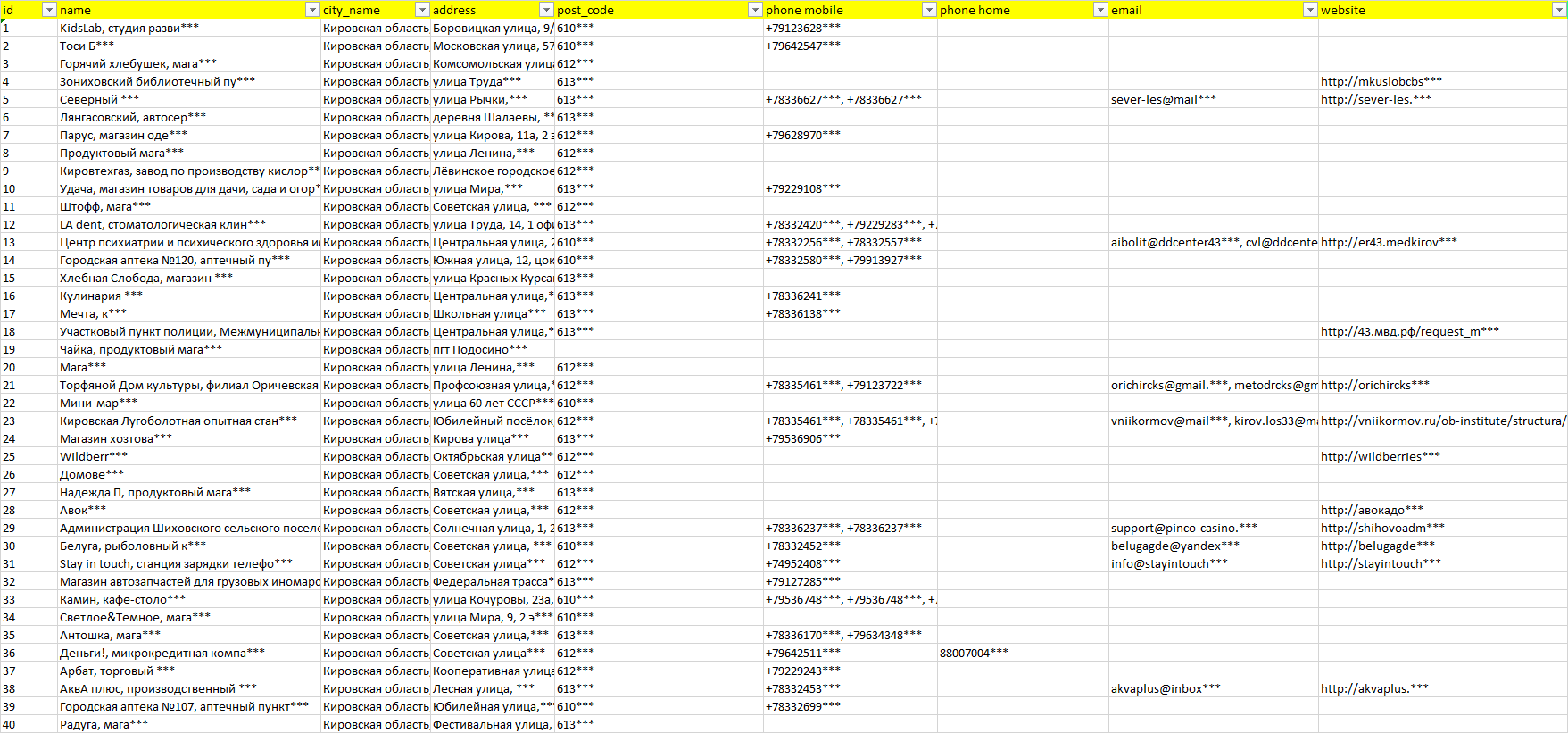 База компаний Кировская область, вся РФ в формате Excel с эл. почтами, телефонами, сайтами, ссылками на соц сети, координатами и другой информацией. Скачайте демо версию, чтобы ознакомиться с данными.