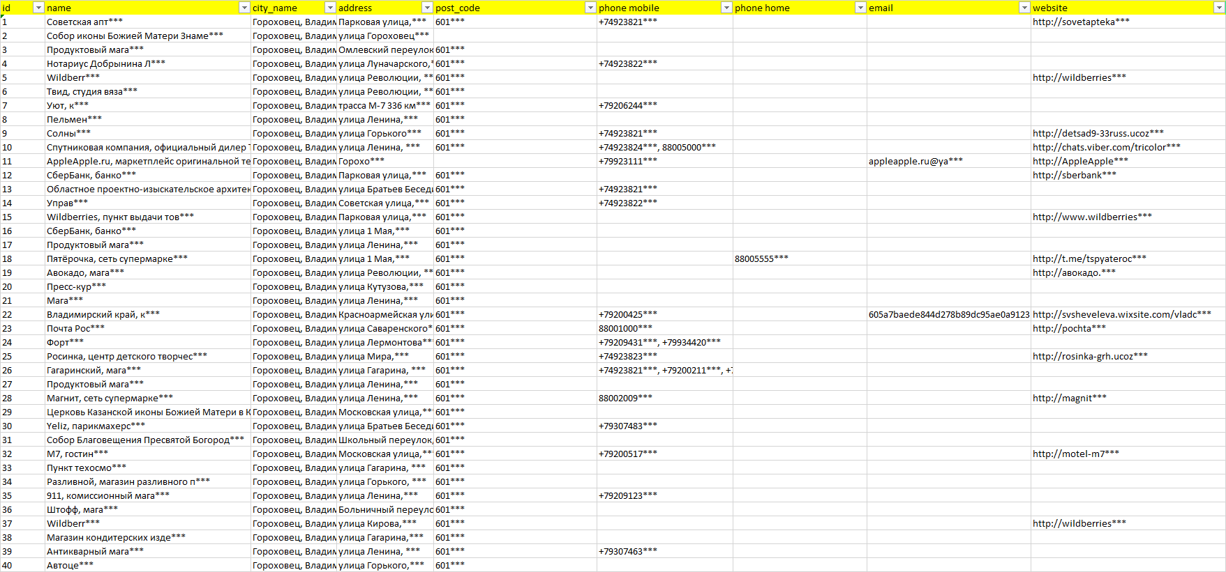 База организаций Гороховец, вся Россия в формате Excel с эл. почтами, телефонами, сайтами, ссылками на соц сети, координатами и другой информацией. Скачайте демо версию, чтобы ознакомиться с данными.