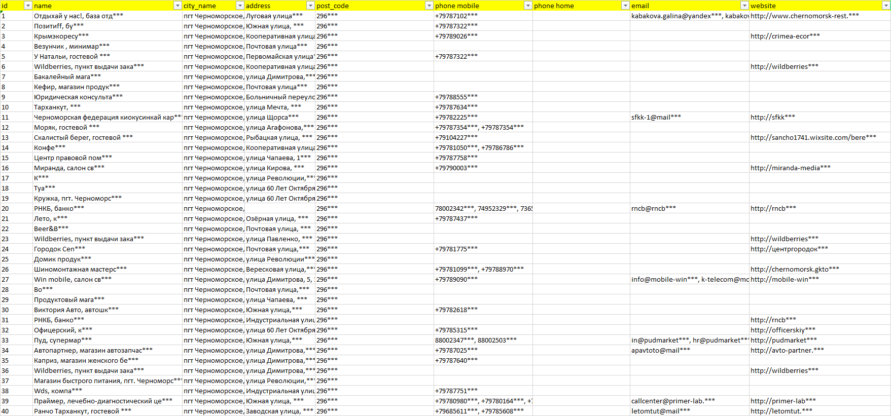База компаний пгт Черноморское, вся РФ в формате Excel с эл. почтами, телефонами, сайтами, ссылками на соц сети, координатами и другой информацией. Скачайте демо версию, чтобы ознакомиться с данными.