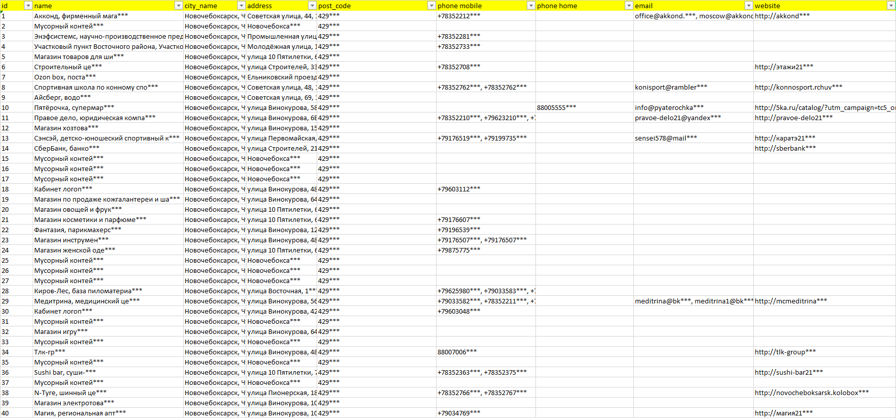 База компаний Новочебоксарск, вся РФ в формате Excel с эл. почтами, телефонами, сайтами, ссылками на соц сети, координатами и другой информацией. Скачайте демо версию, чтобы ознакомиться с данными.