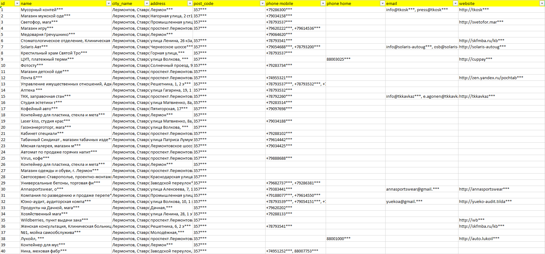 База организаций Лермонтов, вся Россия в формате Excel с эл. почтами, телефонами, сайтами, ссылками на соц сети, координатами и другой информацией. Скачайте демо версию, чтобы ознакомиться с данными.