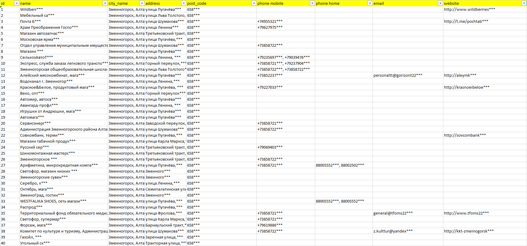 База организаций Змеиногорск, вся Россия в формате Excel с эл. почтами, телефонами, сайтами, ссылками на соц сети, координатами и другой информацией. Скачайте демо версию, чтобы ознакомиться с данными.