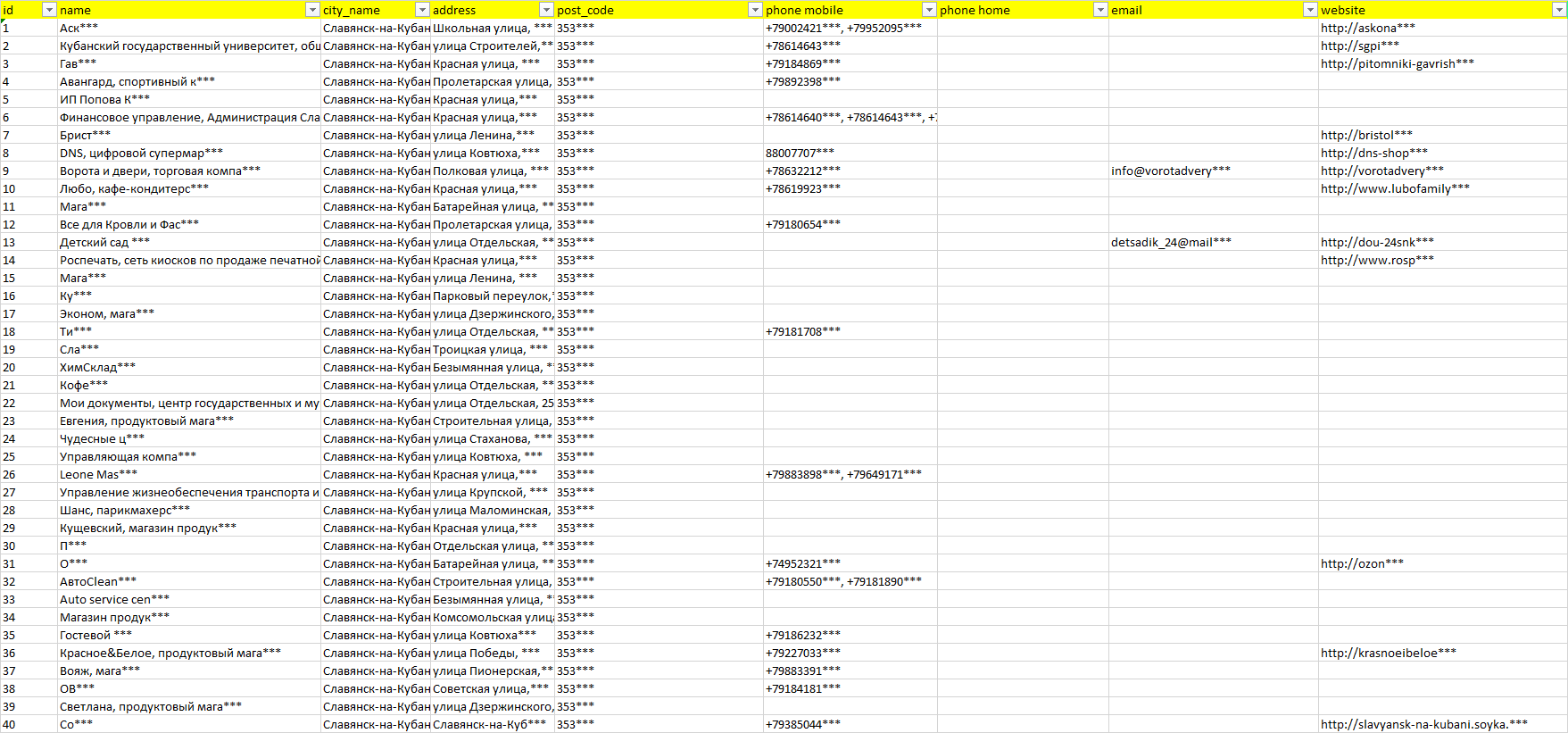 База организаций Славянск-на-Кубани, вся Россия в формате Excel с эл. почтами, телефонами, сайтами, ссылками на соц сети, координатами и другой информацией. Скачайте демо версию, чтобы ознакомиться с данными.