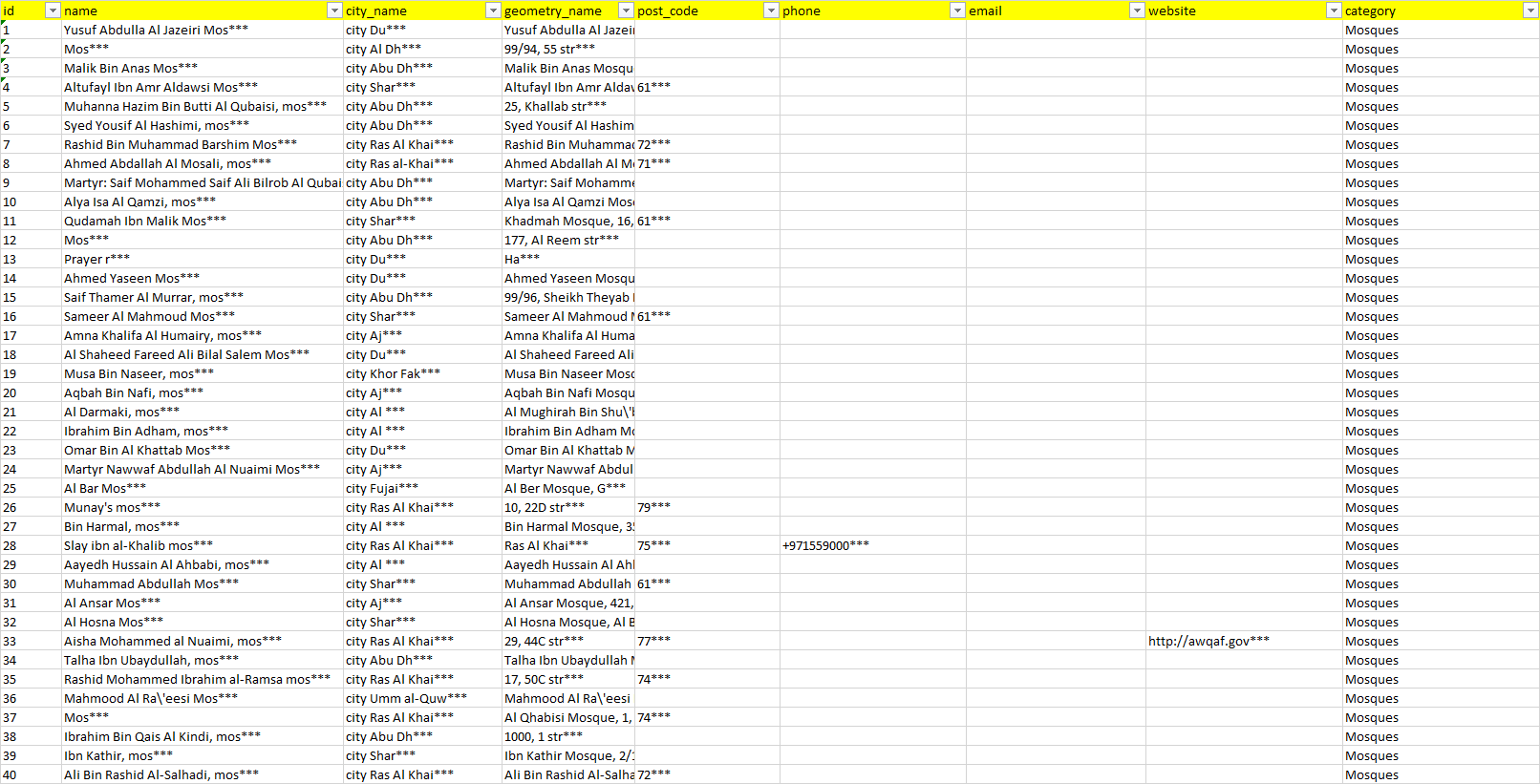 База организаций мечети Объединённые Арабские Эмираты в формате Excel с эл. почтами, телефонами, сайтами, ссылками на соц сети, координатами и другой информацией. Скачайте демо версию, чтобы ознакомиться с данными.