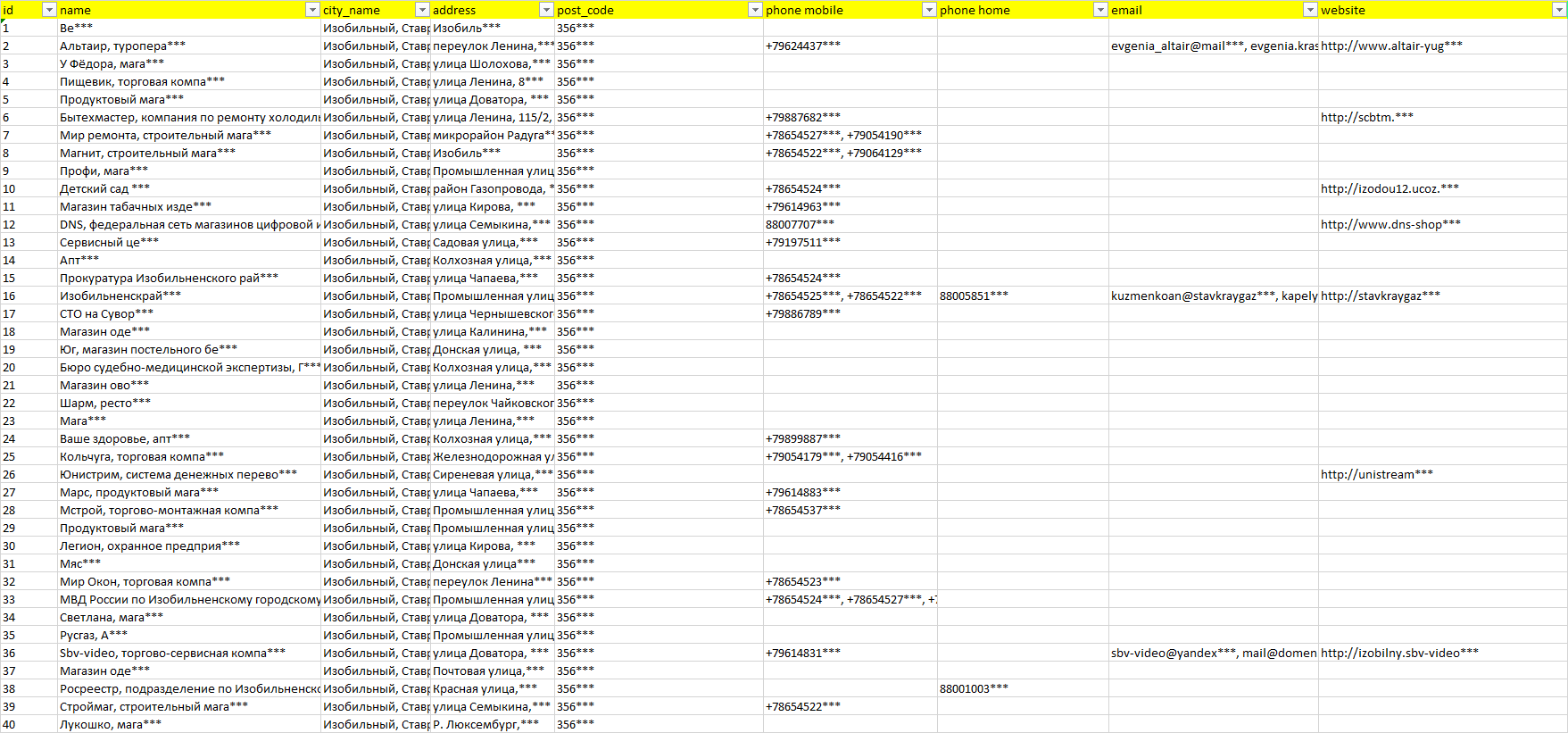 База компаний Изобильный, вся РФ в формате Excel с эл. почтами, телефонами, сайтами, ссылками на соц сети, координатами и другой информацией. Скачайте демо версию, чтобы ознакомиться с данными.