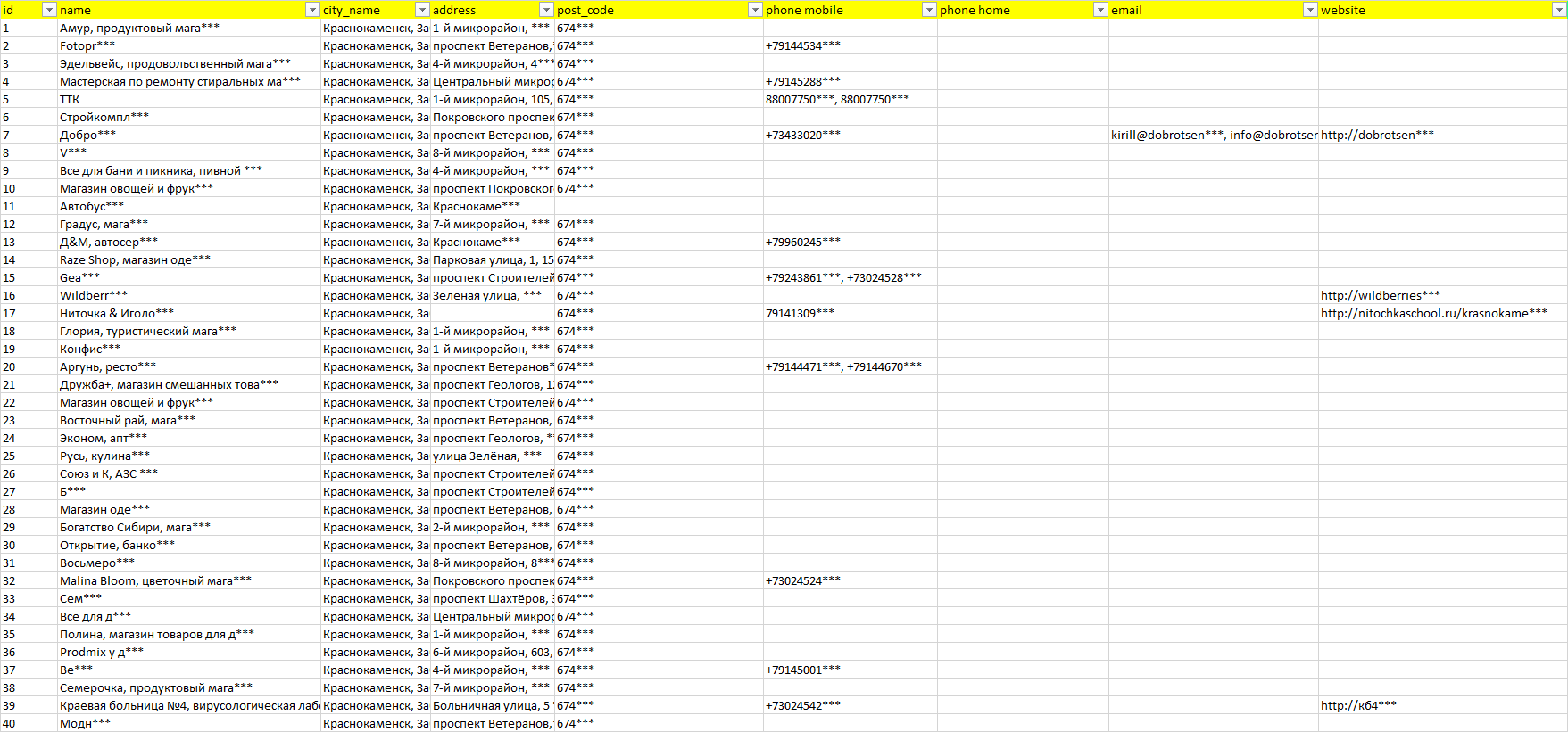 База организаций Краснокаменск, вся Россия в формате Excel с эл. почтами, телефонами, сайтами, ссылками на соц сети, координатами и другой информацией. Скачайте демо версию, чтобы ознакомиться с данными.