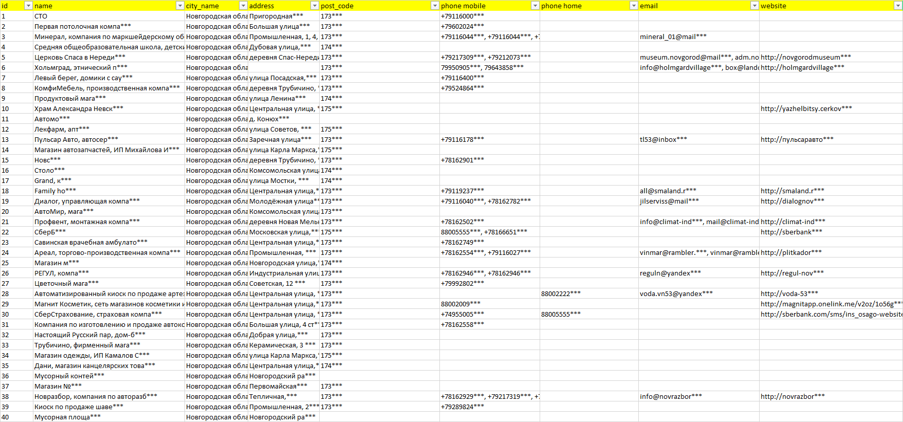 База организаций Новгородская область, вся Россия в формате Excel с эл. почтами, телефонами, сайтами, ссылками на соц сети, координатами и другой информацией. Скачайте демо версию, чтобы ознакомиться с данными.