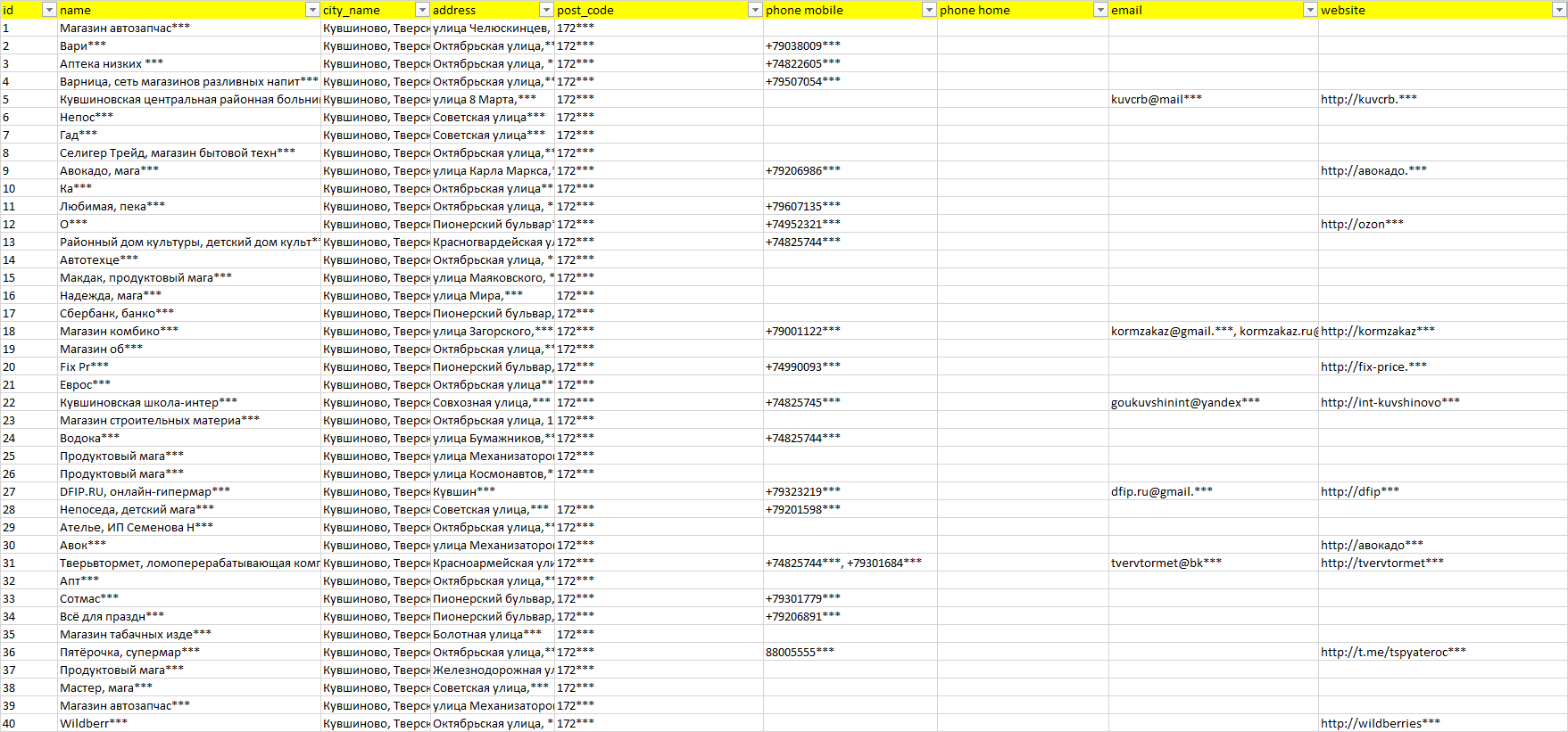 База компаний Кувшиново, вся РФ в формате Excel с эл. почтами, телефонами, сайтами, ссылками на соц сети, координатами и другой информацией. Скачайте демо версию, чтобы ознакомиться с данными.