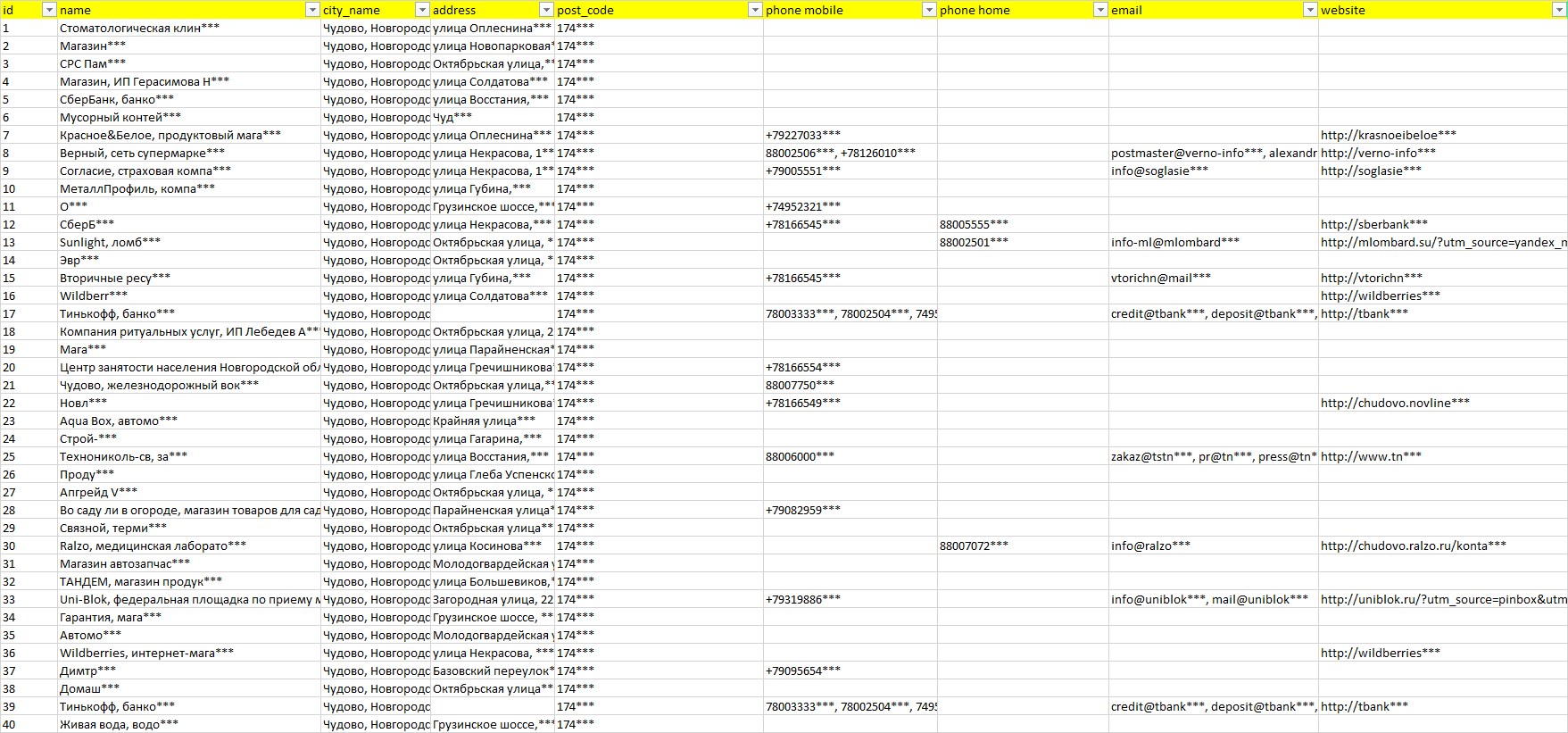 База организаций Чудово, вся Россия в формате Excel с эл. почтами, телефонами, сайтами, ссылками на соц сети, координатами и другой информацией. Скачайте демо версию, чтобы ознакомиться с данными.