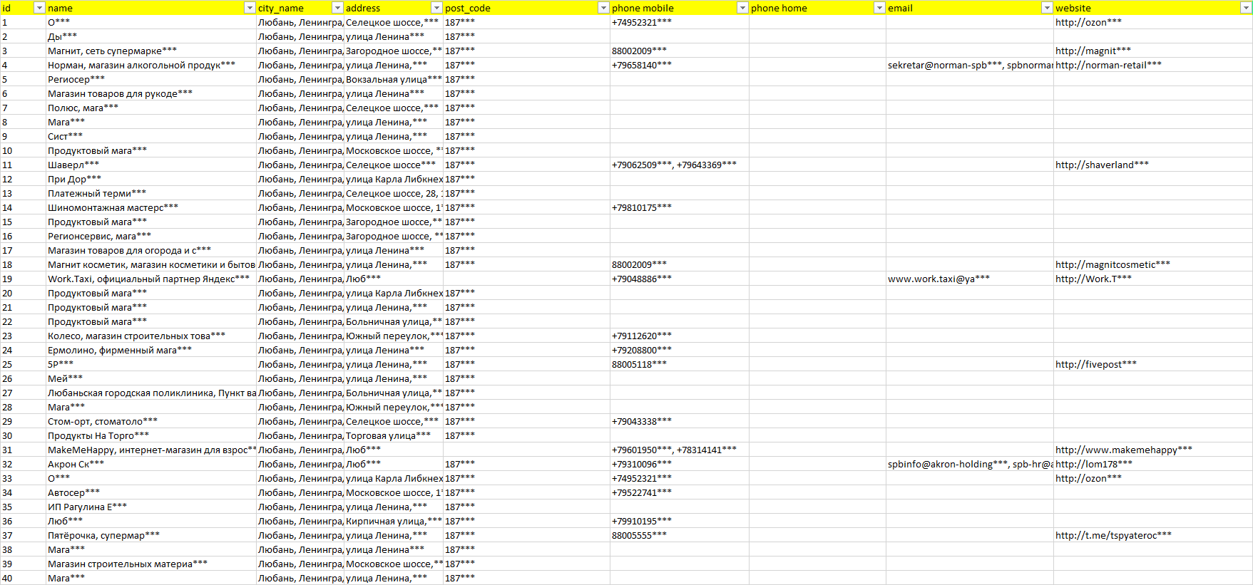 База организаций Любань, вся Россия в формате Excel с эл. почтами, телефонами, сайтами, ссылками на соц сети, координатами и другой информацией. Скачайте демо версию, чтобы ознакомиться с данными.