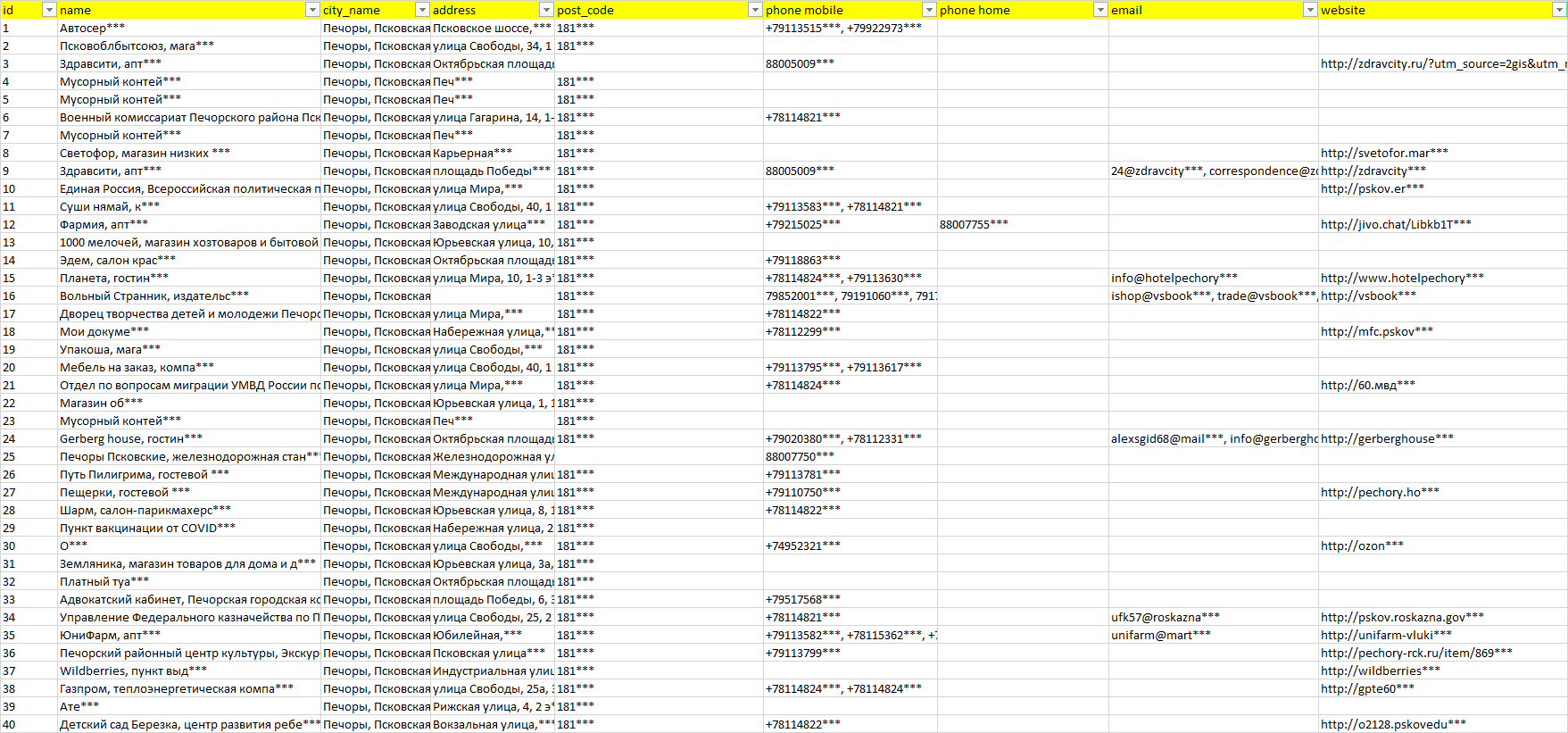 База организаций Печоры, вся Россия в формате Excel с эл. почтами, телефонами, сайтами, ссылками на соц сети, координатами и другой информацией. Скачайте демо версию, чтобы ознакомиться с данными.