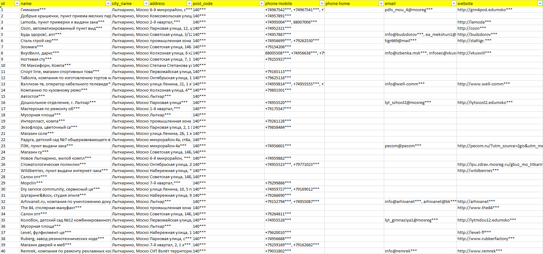 База компаний Лыткарино, вся РФ в формате Excel с эл. почтами, телефонами, сайтами, ссылками на соц сети, координатами и другой информацией. Скачайте демо версию, чтобы ознакомиться с данными.