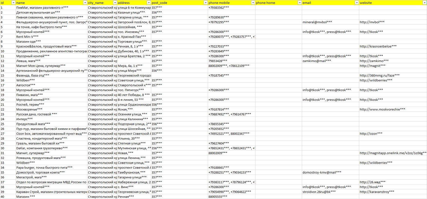 База организаций Ставропольский край, вся Россия в формате Excel с эл. почтами, телефонами, сайтами, ссылками на соц сети, координатами и другой информацией. Скачайте демо версию, чтобы ознакомиться с данными.