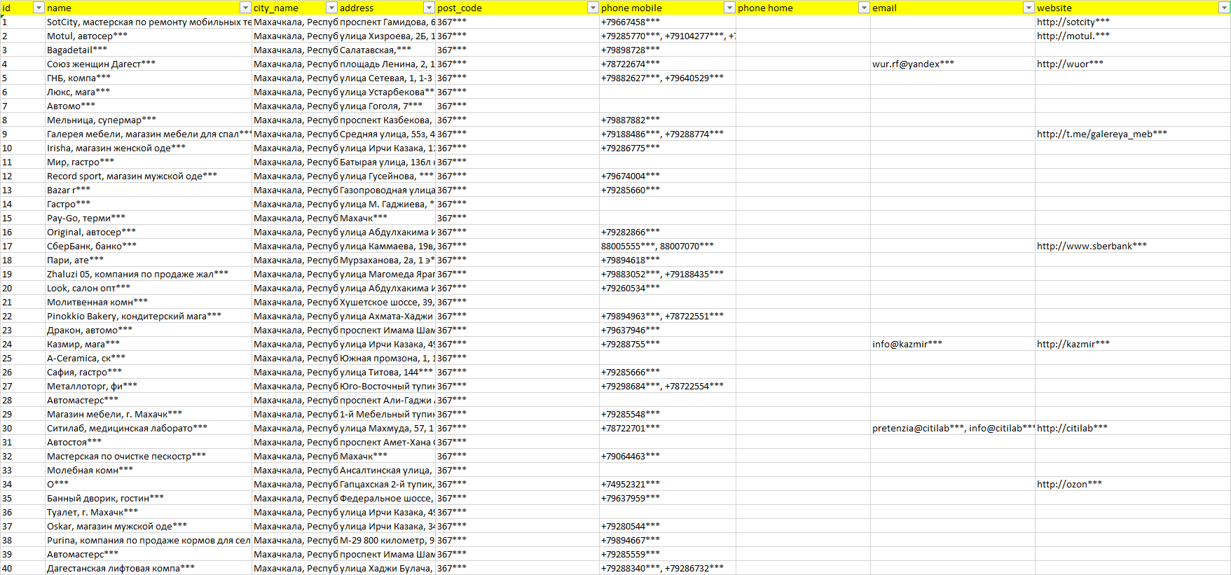 База компаний Махачкала, вся РФ в формате Excel с эл. почтами, телефонами, сайтами, ссылками на соц сети, координатами и другой информацией. Скачайте демо версию, чтобы ознакомиться с данными.