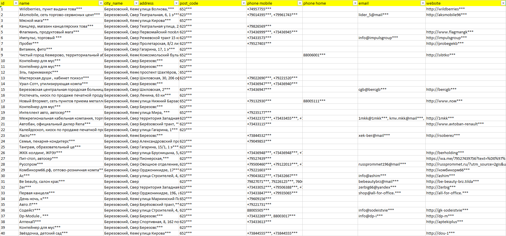 База компаний Березовский, вся РФ в формате Excel с эл. почтами, телефонами, сайтами, ссылками на соц сети, координатами и другой информацией. Скачайте демо версию, чтобы ознакомиться с данными.