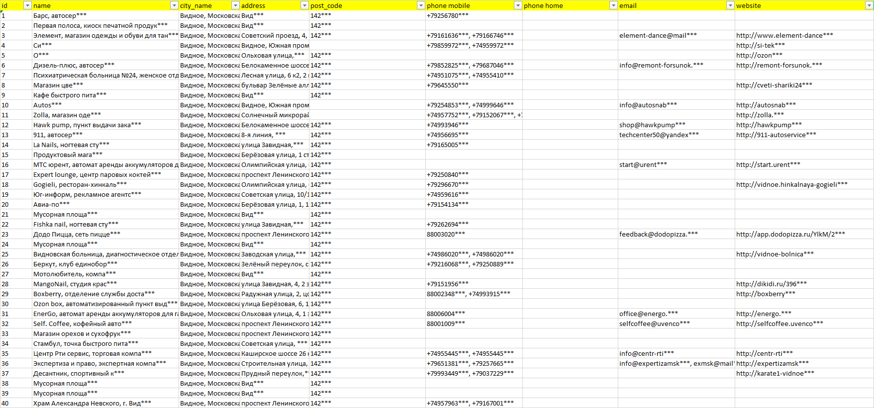 База организаций Видное, вся Россия в формате Excel с эл. почтами, телефонами, сайтами, ссылками на соц сети, координатами и другой информацией. Скачайте демо версию, чтобы ознакомиться с данными.