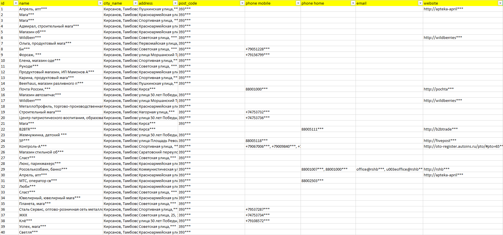 База организаций Кирсанов, вся Россия в формате Excel с эл. почтами, телефонами, сайтами, ссылками на соц сети, координатами и другой информацией. Скачайте демо версию, чтобы ознакомиться с данными.