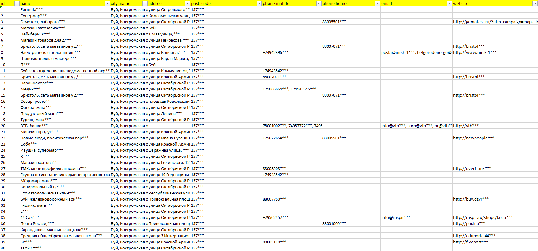 База компаний Буй, вся РФ в формате Excel с эл. почтами, телефонами, сайтами, ссылками на соц сети, координатами и другой информацией. Скачайте демо версию, чтобы ознакомиться с данными.