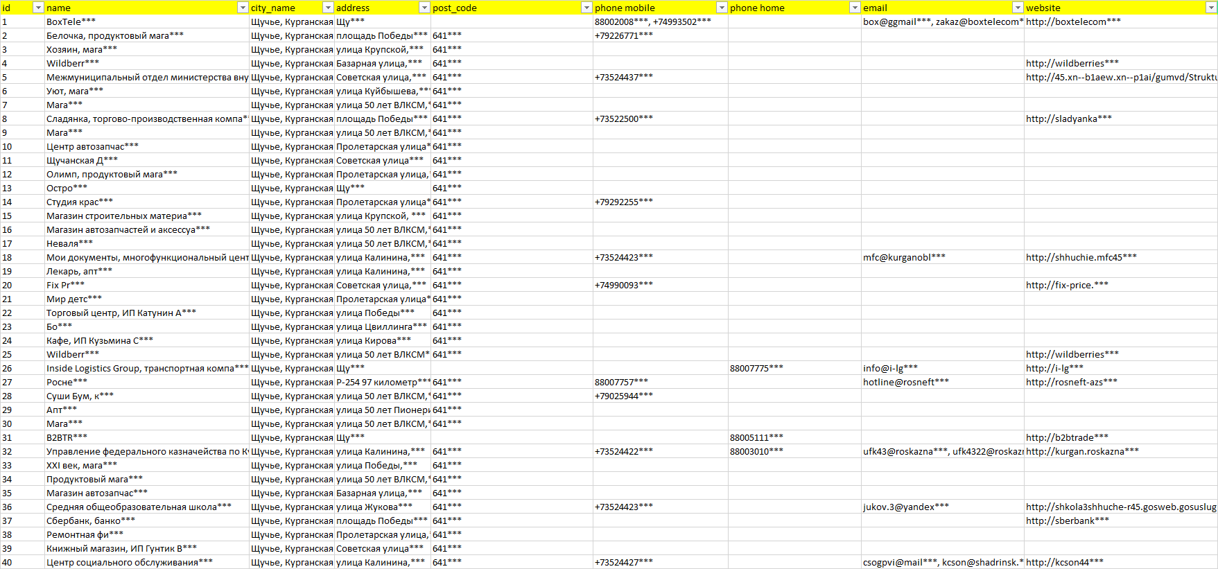 База организаций Щучье, вся Россия в формате Excel с эл. почтами, телефонами, сайтами, ссылками на соц сети, координатами и другой информацией. Скачайте демо версию, чтобы ознакомиться с данными.