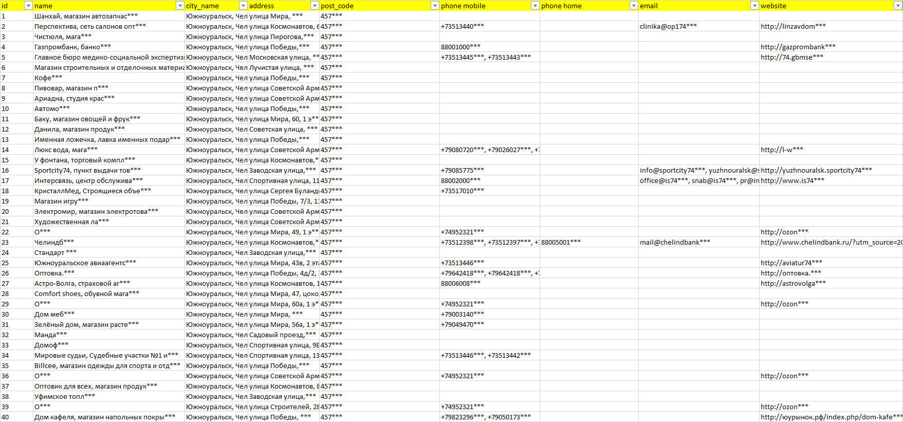 База компаний Южноуральск, вся РФ в формате Excel с эл. почтами, телефонами, сайтами, ссылками на соц сети, координатами и другой информацией. Скачайте демо версию, чтобы ознакомиться с данными.