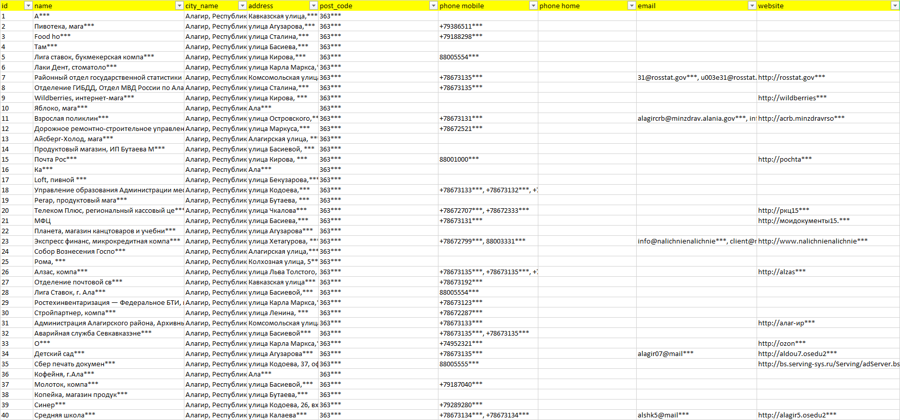База компаний Алагир, вся РФ в формате Excel с эл. почтами, телефонами, сайтами, ссылками на соц сети, координатами и другой информацией. Скачайте демо версию, чтобы ознакомиться с данными.