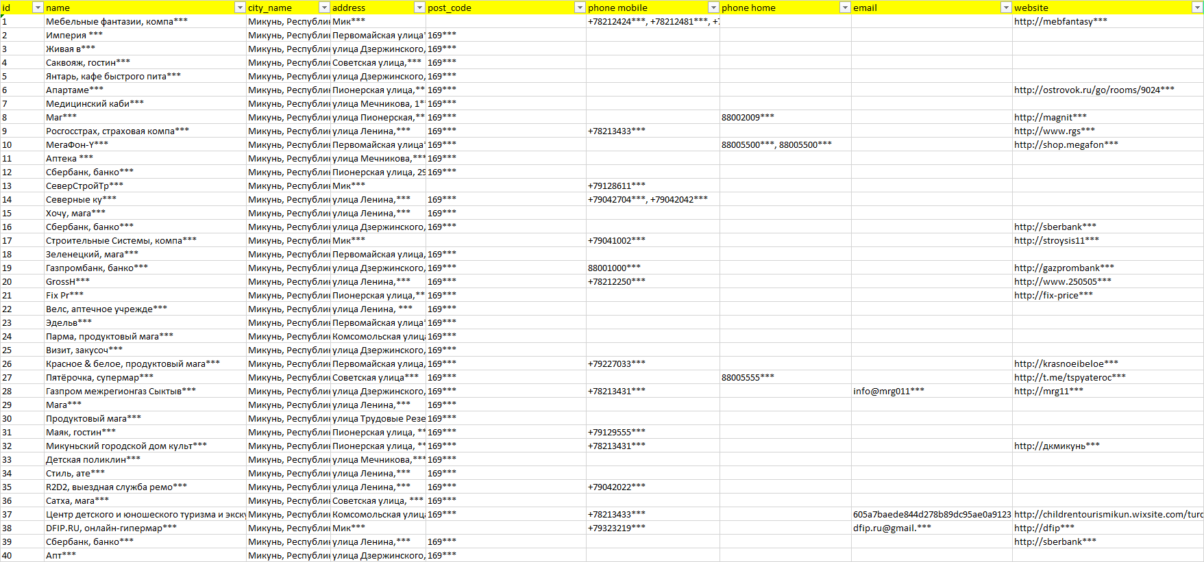 База организаций Микунь, вся Россия в формате Excel с эл. почтами, телефонами, сайтами, ссылками на соц сети, координатами и другой информацией. Скачайте демо версию, чтобы ознакомиться с данными.