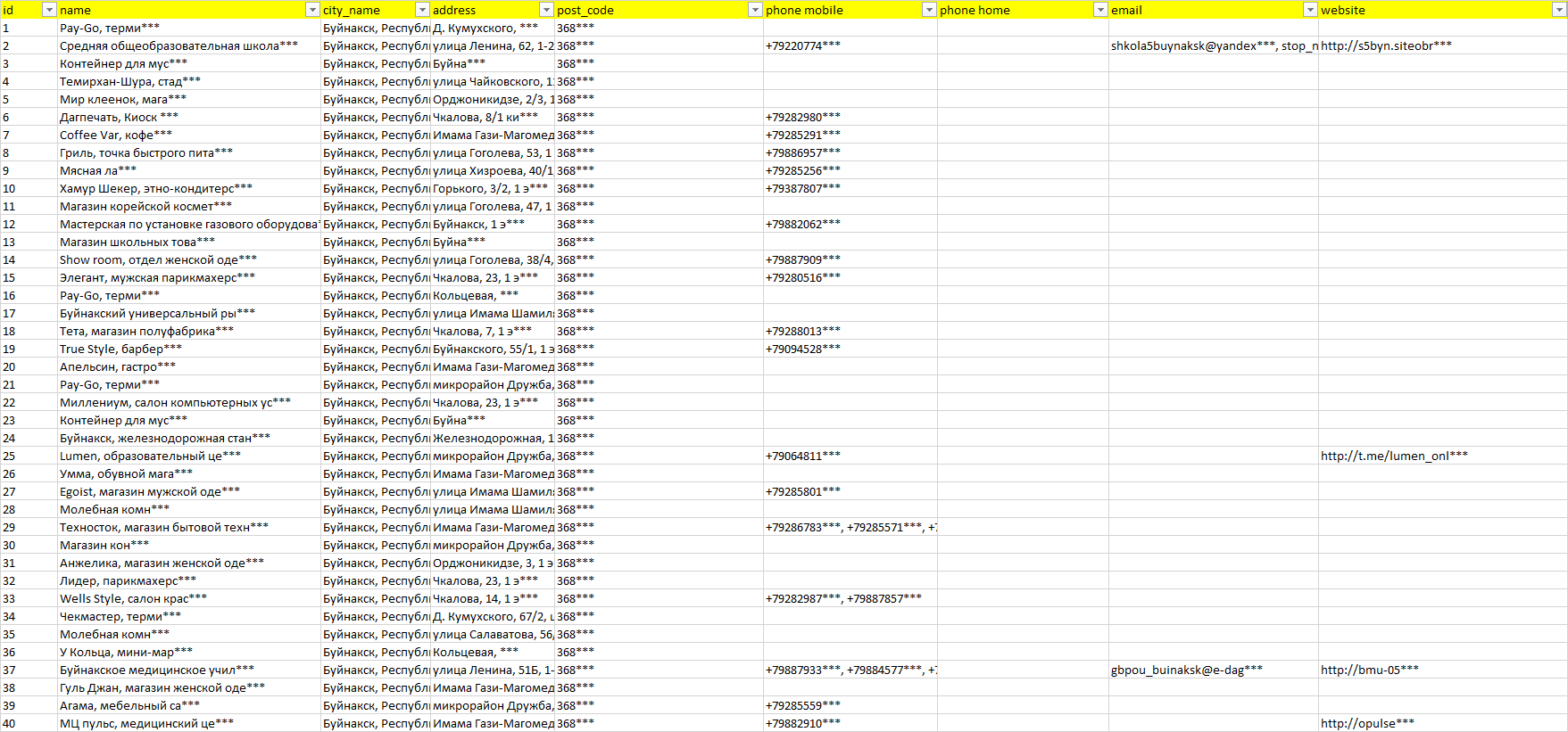 База компаний Буйнакск, вся РФ в формате Excel с эл. почтами, телефонами, сайтами, ссылками на соц сети, координатами и другой информацией. Скачайте демо версию, чтобы ознакомиться с данными.