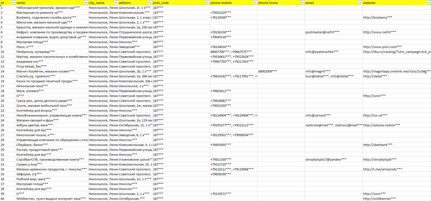 База компаний Никольское, вся РФ в формате Excel с эл. почтами, телефонами, сайтами, ссылками на соц сети, координатами и другой информацией. Скачайте демо версию, чтобы ознакомиться с данными.