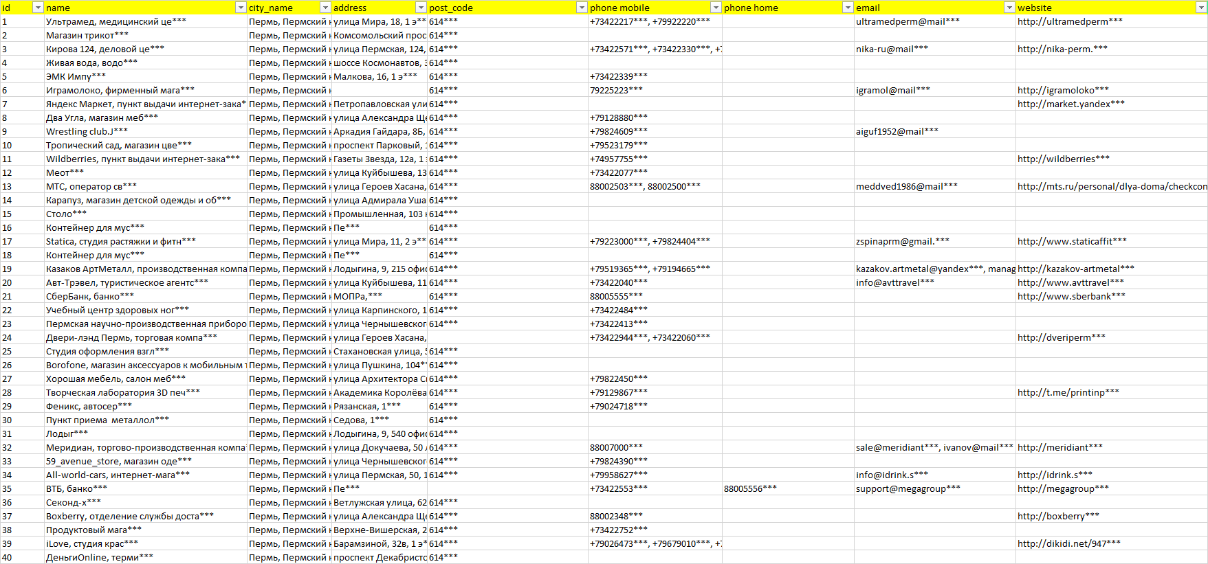База компаний Пермь, вся РФ в формате Excel с эл. почтами, телефонами, сайтами, ссылками на соц сети, координатами и другой информацией. Скачайте демо версию, чтобы ознакомиться с данными.