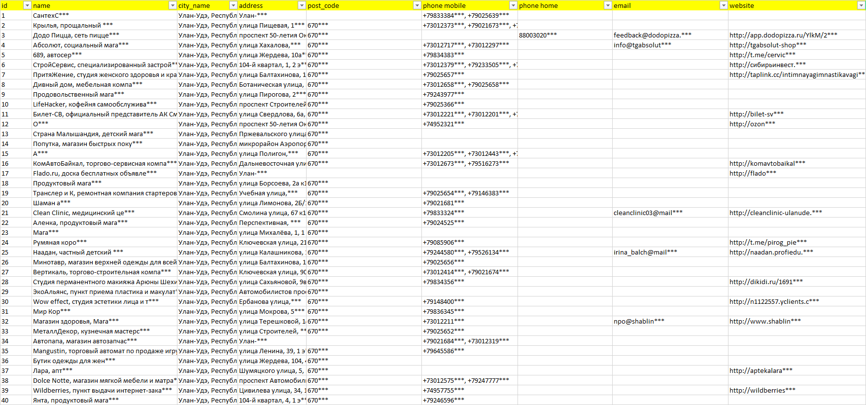 База компаний Улан-Удэ, вся РФ в формате Excel с эл. почтами, телефонами, сайтами, ссылками на соц сети, координатами и другой информацией. Скачайте демо версию, чтобы ознакомиться с данными.