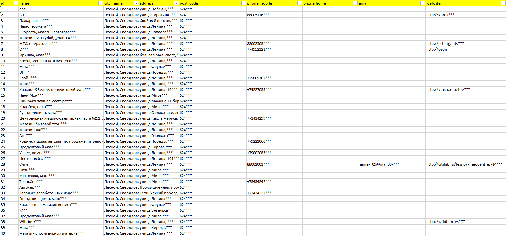База организаций Лесной, вся Россия в формате Excel с эл. почтами, телефонами, сайтами, ссылками на соц сети, координатами и другой информацией. Скачайте демо версию, чтобы ознакомиться с данными.