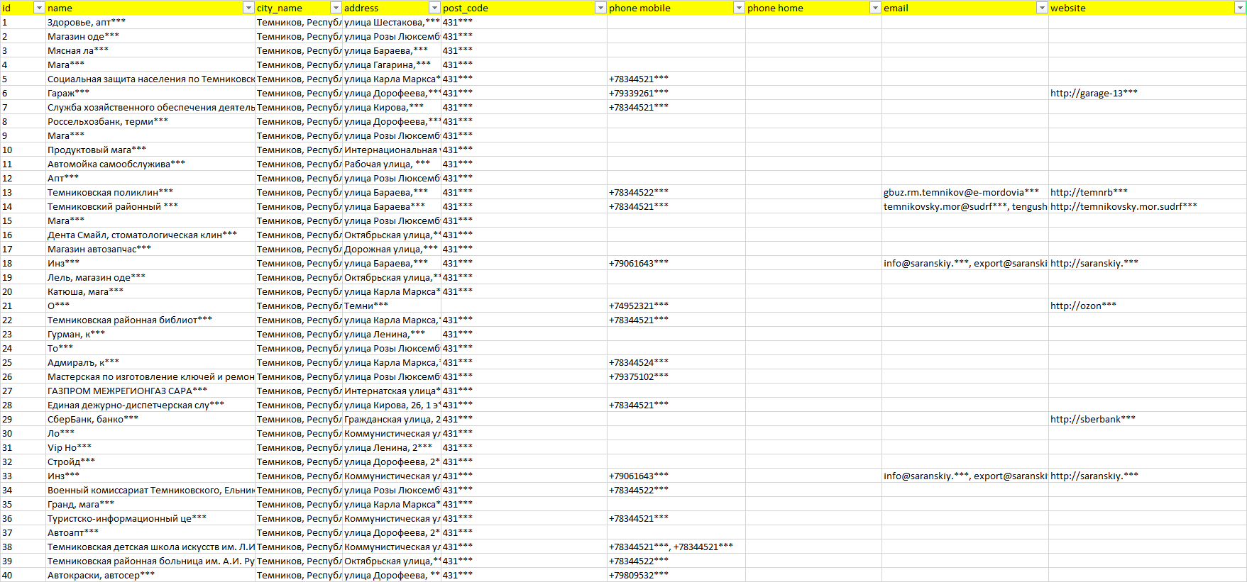База организаций Темников, вся Россия в формате Excel с эл. почтами, телефонами, сайтами, ссылками на соц сети, координатами и другой информацией. Скачайте демо версию, чтобы ознакомиться с данными.