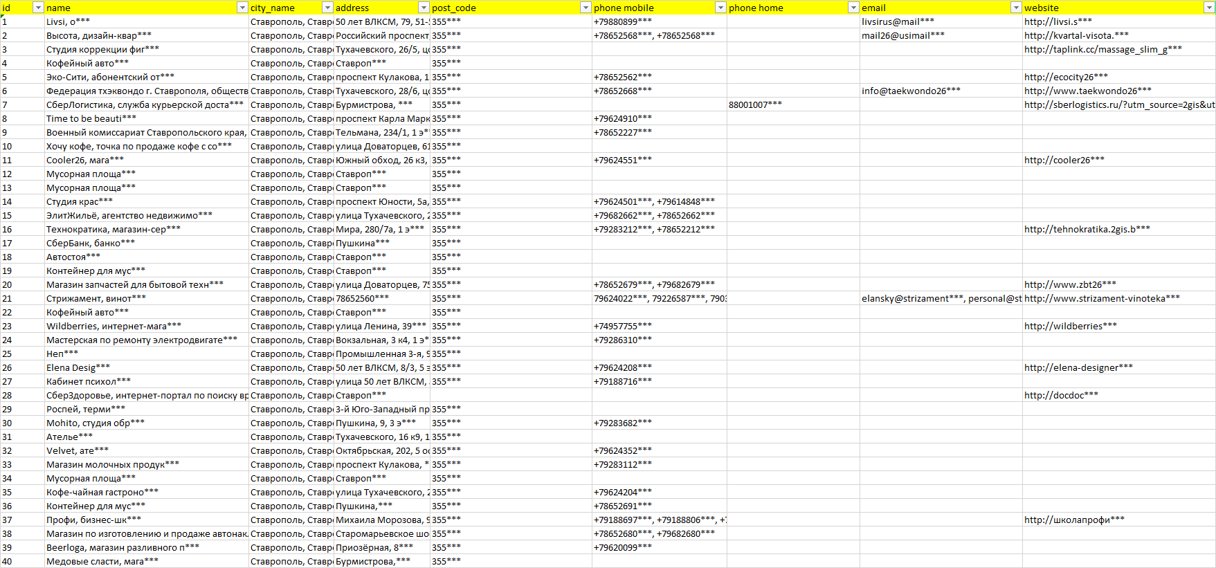База организаций Ставрополь, вся Россия в формате Excel с эл. почтами, телефонами, сайтами, ссылками на соц сети, координатами и другой информацией. Скачайте демо версию, чтобы ознакомиться с данными.