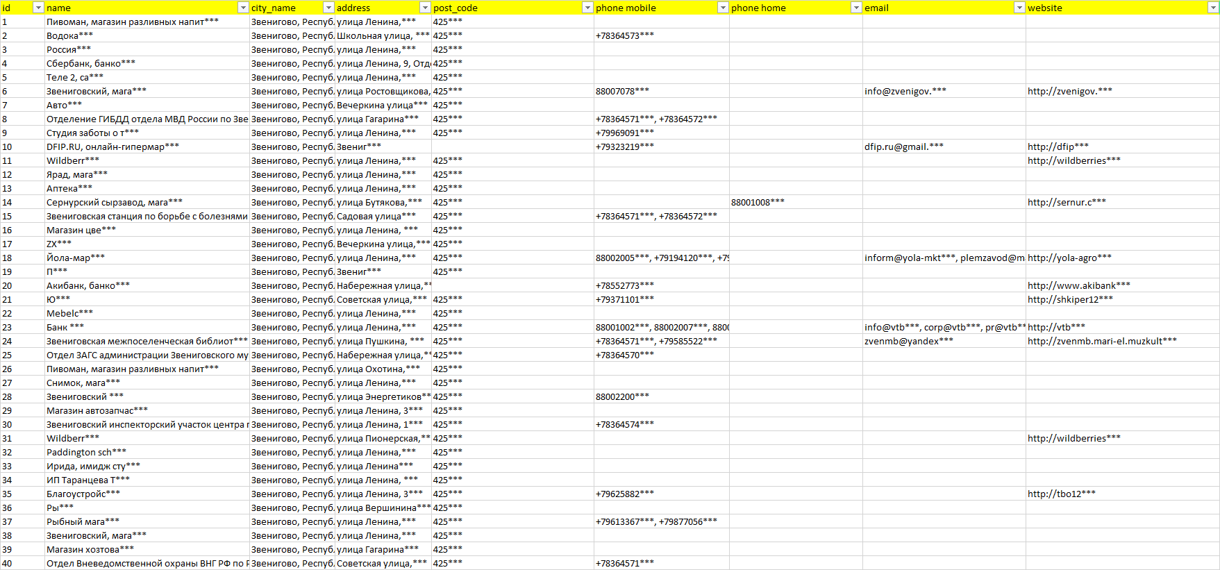 База организаций Звенигово, вся Россия в формате Excel с эл. почтами, телефонами, сайтами, ссылками на соц сети, координатами и другой информацией. Скачайте демо версию, чтобы ознакомиться с данными.