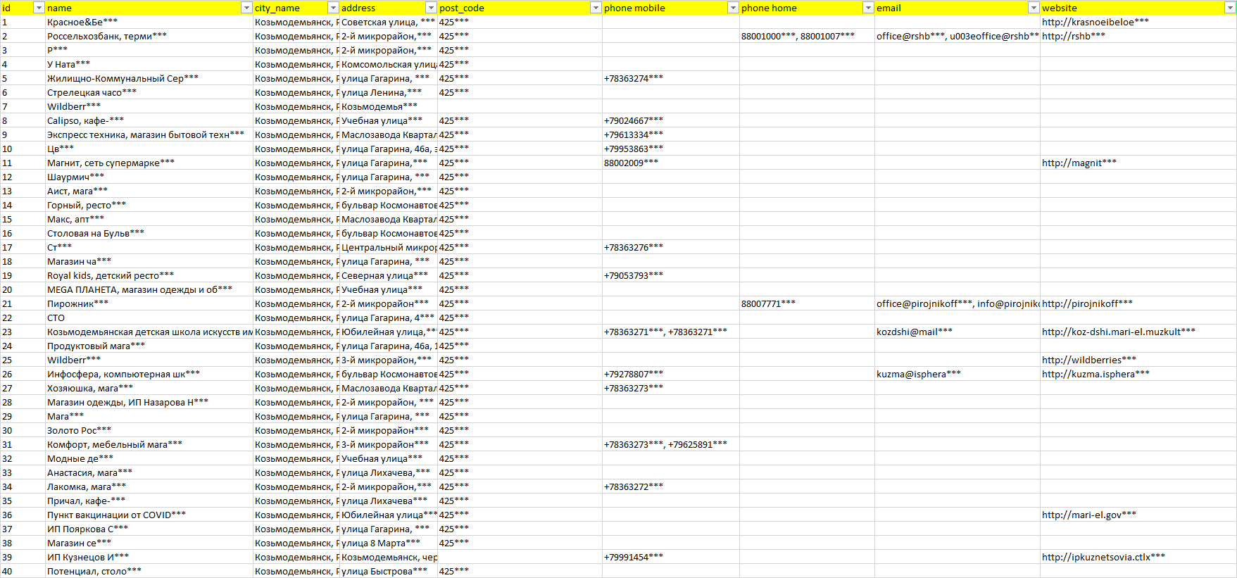 База организаций Козьмодемьянск, вся Россия в формате Excel с эл. почтами, телефонами, сайтами, ссылками на соц сети, координатами и другой информацией. Скачайте демо версию, чтобы ознакомиться с данными.
