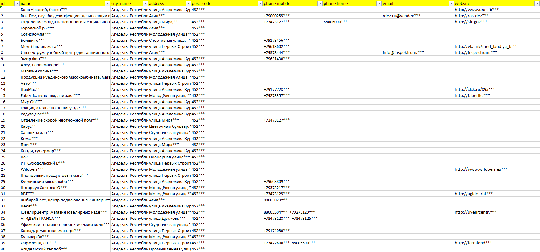 База компаний Агидель, вся РФ в формате Excel с эл. почтами, телефонами, сайтами, ссылками на соц сети, координатами и другой информацией. Скачайте демо версию, чтобы ознакомиться с данными.