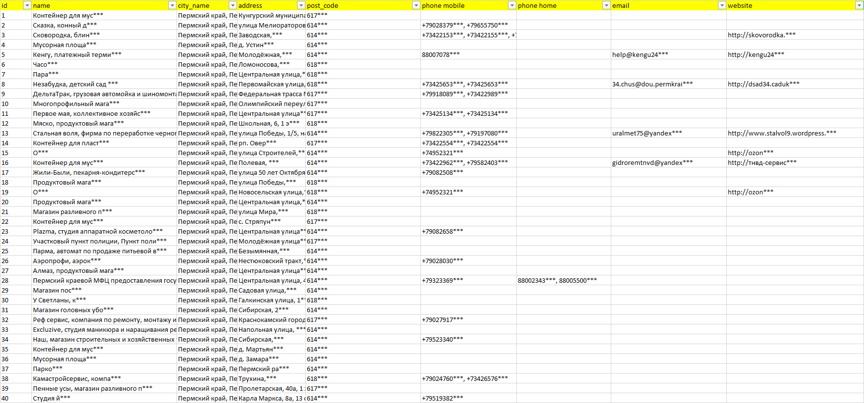 База компаний Пермский край, вся РФ в формате Excel с эл. почтами, телефонами, сайтами, ссылками на соц сети, координатами и другой информацией. Скачайте демо версию, чтобы ознакомиться с данными.