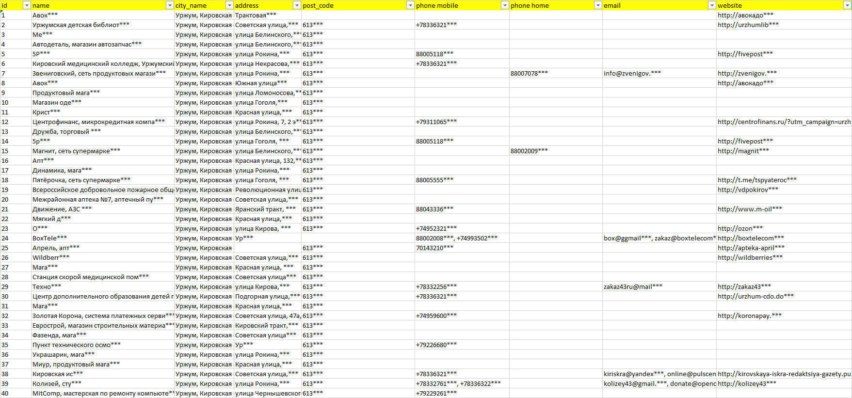 База компаний Уржум, вся РФ в формате Excel с эл. почтами, телефонами, сайтами, ссылками на соц сети, координатами и другой информацией. Скачайте демо версию, чтобы ознакомиться с данными.