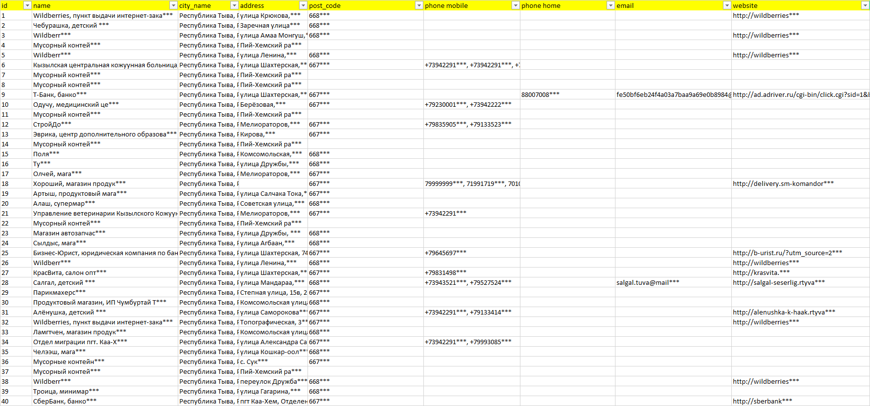 База организаций Республика Тыва, вся Россия в формате Excel с эл. почтами, телефонами, сайтами, ссылками на соц сети, координатами и другой информацией. Скачайте демо версию, чтобы ознакомиться с данными.