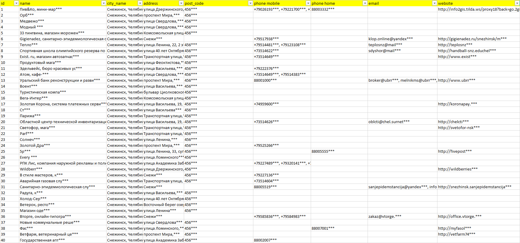 База компаний Снежинск, вся РФ в формате Excel с эл. почтами, телефонами, сайтами, ссылками на соц сети, координатами и другой информацией. Скачайте демо версию, чтобы ознакомиться с данными.