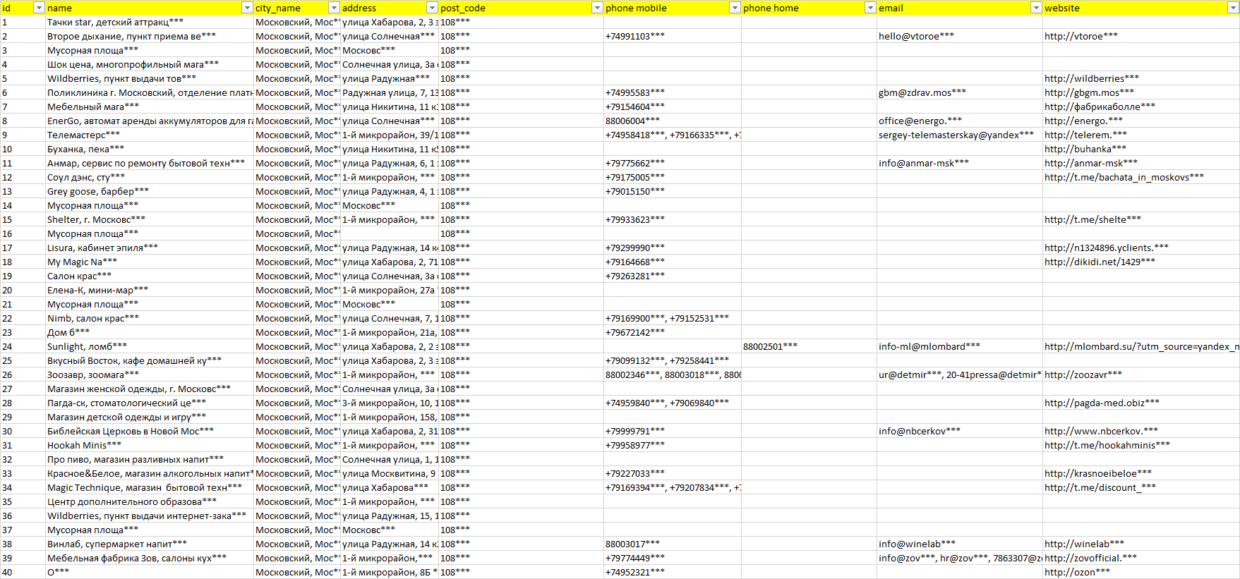 База компаний Московский, вся РФ в формате Excel с эл. почтами, телефонами, сайтами, ссылками на соц сети, координатами и другой информацией. Скачайте демо версию, чтобы ознакомиться с данными.