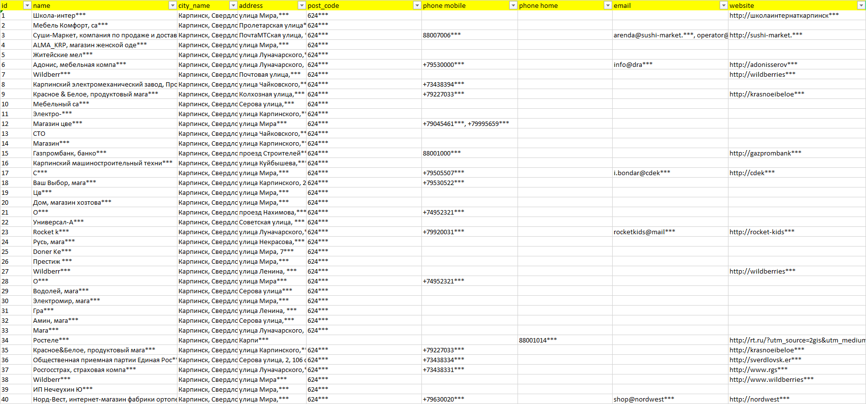 База организаций Карпинск, вся Россия в формате Excel с эл. почтами, телефонами, сайтами, ссылками на соц сети, координатами и другой информацией. Скачайте демо версию, чтобы ознакомиться с данными.