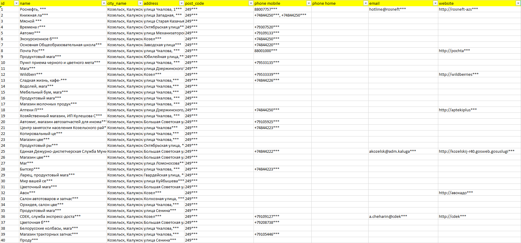 База компаний Козельск, вся РФ в формате Excel с эл. почтами, телефонами, сайтами, ссылками на соц сети, координатами и другой информацией. Скачайте демо версию, чтобы ознакомиться с данными.
