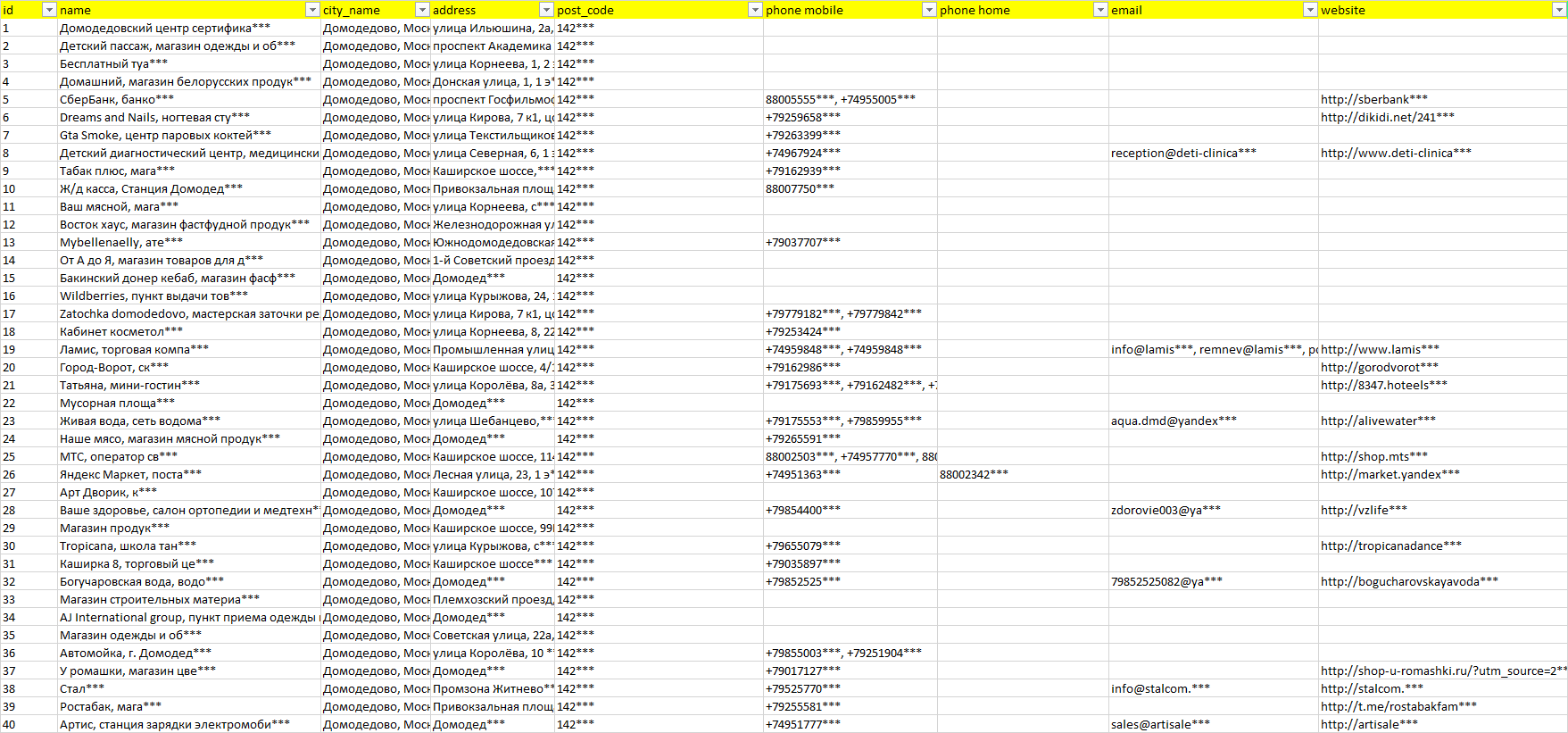 База компаний Домодедово, вся РФ в формате Excel с эл. почтами, телефонами, сайтами, ссылками на соц сети, координатами и другой информацией. Скачайте демо версию, чтобы ознакомиться с данными.