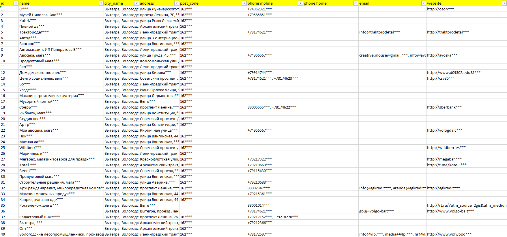 База организаций Вытегра, вся Россия в формате Excel с эл. почтами, телефонами, сайтами, ссылками на соц сети, координатами и другой информацией. Скачайте демо версию, чтобы ознакомиться с данными.