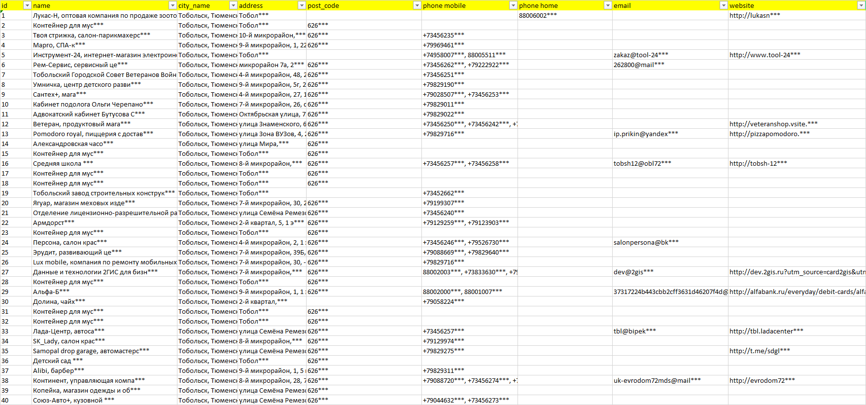 База организаций Тобольск, вся Россия в формате Excel с эл. почтами, телефонами, сайтами, ссылками на соц сети, координатами и другой информацией. Скачайте демо версию, чтобы ознакомиться с данными.