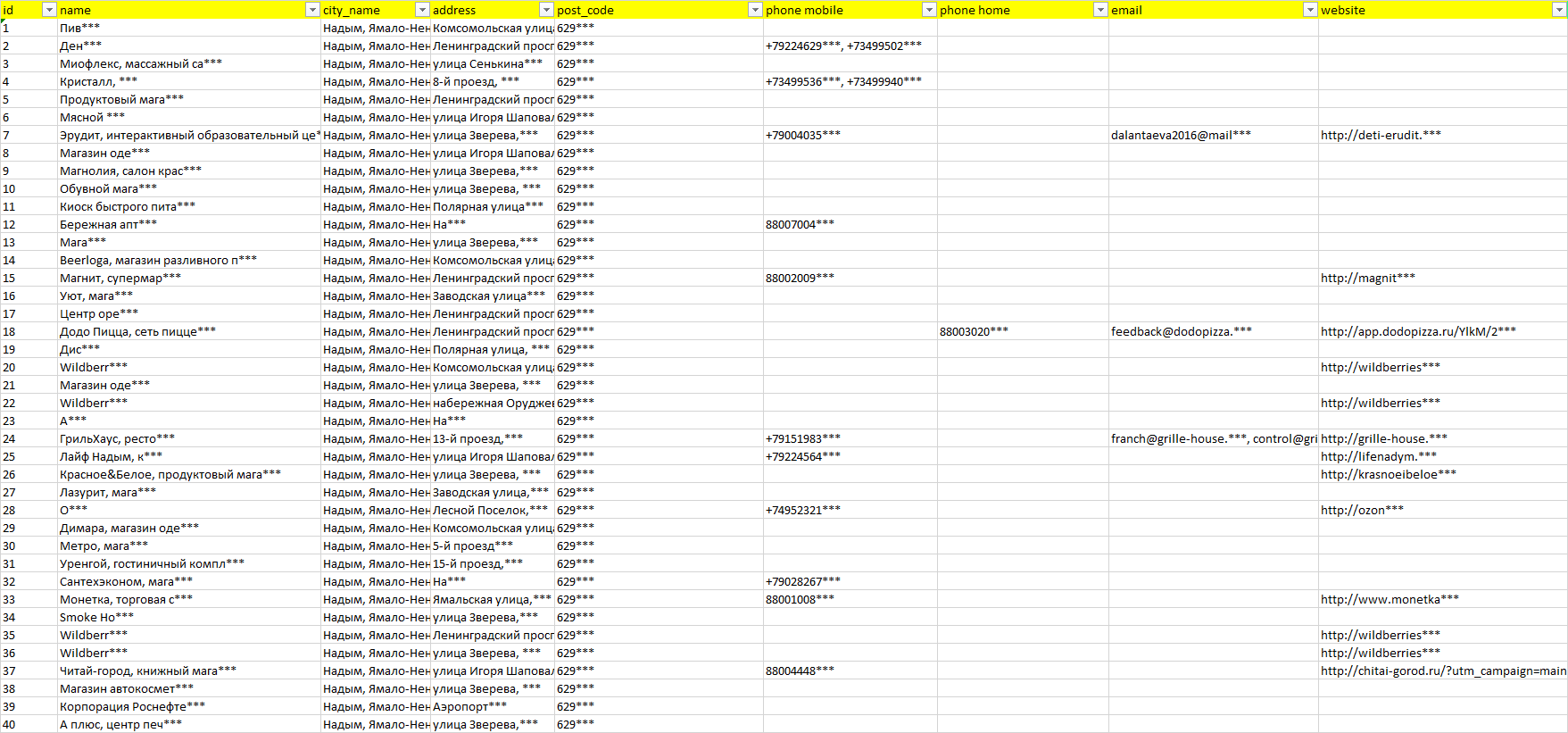 База организаций Надым, вся Россия в формате Excel с эл. почтами, телефонами, сайтами, ссылками на соц сети, координатами и другой информацией. Скачайте демо версию, чтобы ознакомиться с данными.