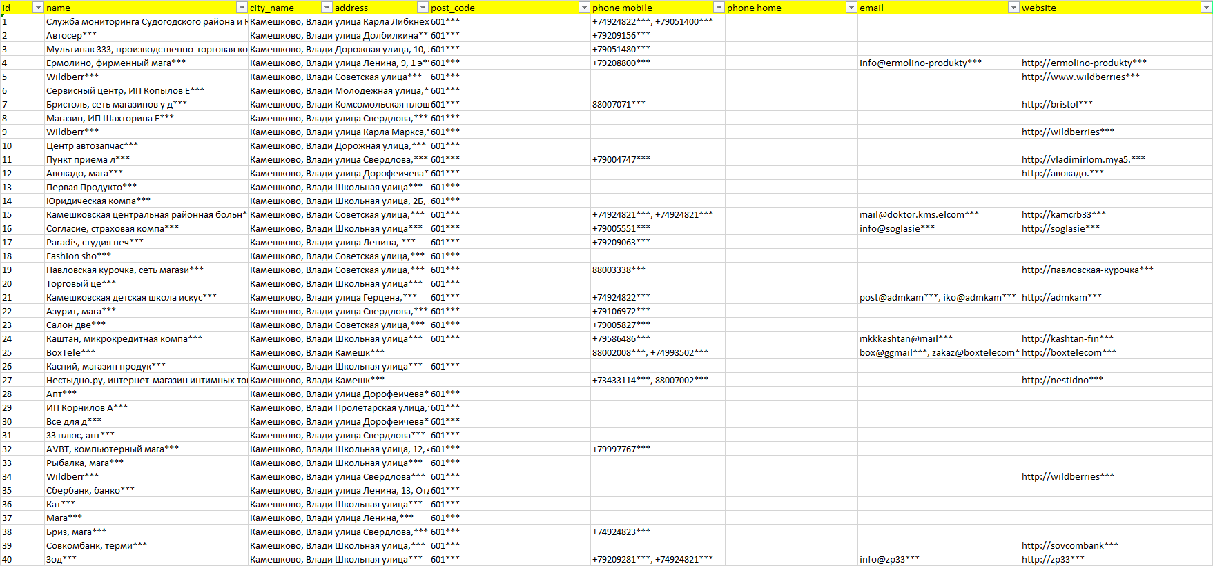База компаний Камешково, вся РФ в формате Excel с эл. почтами, телефонами, сайтами, ссылками на соц сети, координатами и другой информацией. Скачайте демо версию, чтобы ознакомиться с данными.
