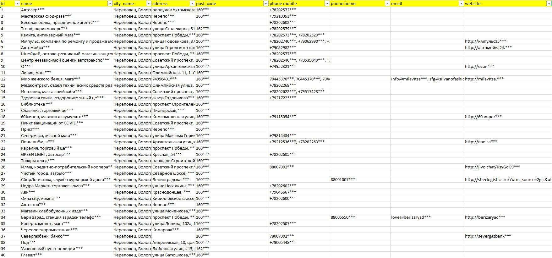 База организаций Череповец, вся Россия в формате Excel с эл. почтами, телефонами, сайтами, ссылками на соц сети, координатами и другой информацией. Скачайте демо версию, чтобы ознакомиться с данными.